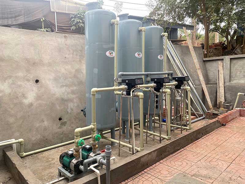 Các cột lọc áp lực bằng thép phủ epoxy chống ăn mòn được cố định chắc chắn trên bệ móng bê tông. Hệ thống đường ống dẫn nước được bố trí khoa học, đảm bảo dòng chảy ổn định và hạn chế tối đa rò rỉ trong quá trình vận hành.