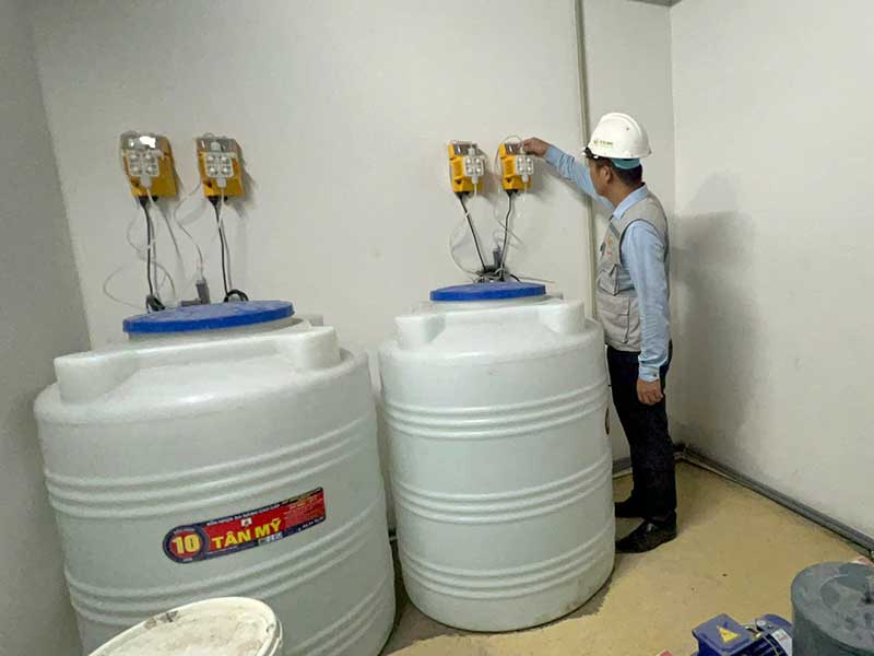 Bơm định lượng PVDF/Teflon; đồng hồ Flowtech; thùng pha hóa chất 500L |