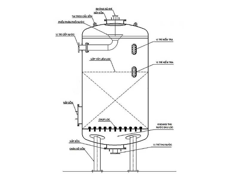 Bên trong bồn là hệ thống phân phối nước, vật liệu lọc và các đường kết nối với van vận hành, cho phép thực hiện đồng thời nhiều chức năng như lọc, rửa ngược, rửa xuôi hoặc hoàn nguyên vật liệu.