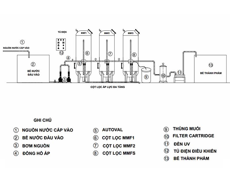 Trung tâm của công nghệ lọc nước mặt hiện đại nằm ở hệ thống lọc vật liệu nhiều lớp được thiết kế theo nguyên lý xử lý tổng hợp. Dòng nước được dẫn qua các lớp vật liệu có kích thước hạt và tính chất bề mặt khác nhau, tạo ra cơ chế loại bỏ đồng thời cả tạp chất rắn và chất hòa tan.