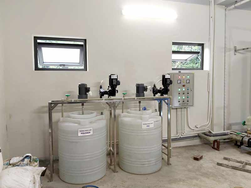 Tại đây, hóa chất keo tụ như PAC kết hợp với Polymer được châm vào dòng nước. Các hạt nhỏ sẽ liên kết lại với nhau, tạo thành bông cặn có kích thước lớn hơn. Dòng nước tiếp tục chảy vào bể lắng. Dưới tác dụng của trọng lực, các bông cặn sẽ lắng xuống đáy bể và được tách ra khỏi nước. Nhờ quá trình này, độ đục giảm đáng kể trước khi nước đi vào hệ thống lọc. Điều này giúp nâng cao hiệu quả lọc và kéo dài tuổi thọ vật liệu.