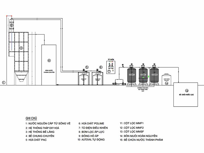 Sơ đồ công nghệ của hệ thống lọc nước công nghiệp 15m3/h tại Quảng Trị