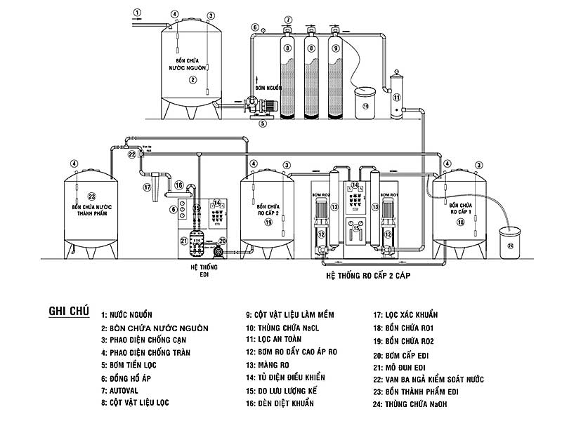 Sơ đồ công nghệ hệ thống lọc nước siêu tinh khiết