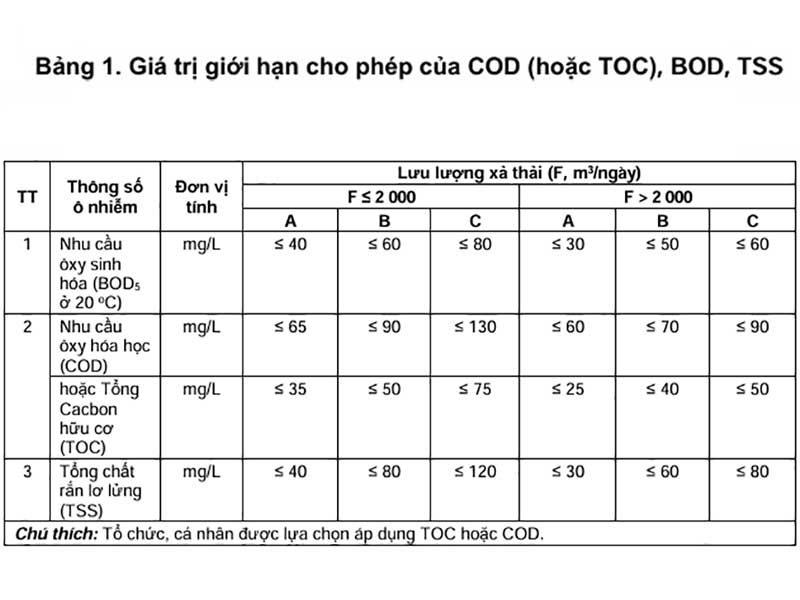 Giá trị giới hạn cho phép của COD (hoặc TOC), BOD, TSS