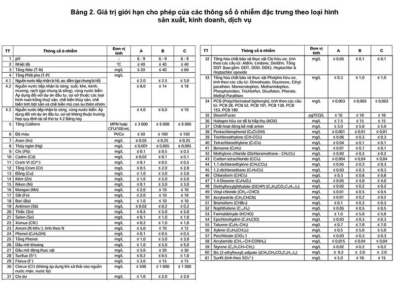 Giá trị giới hạn cho phép của các thông số ô nhiễm đặc trưng theo loại hình sản xuất, kinh doanh, dịch vụ