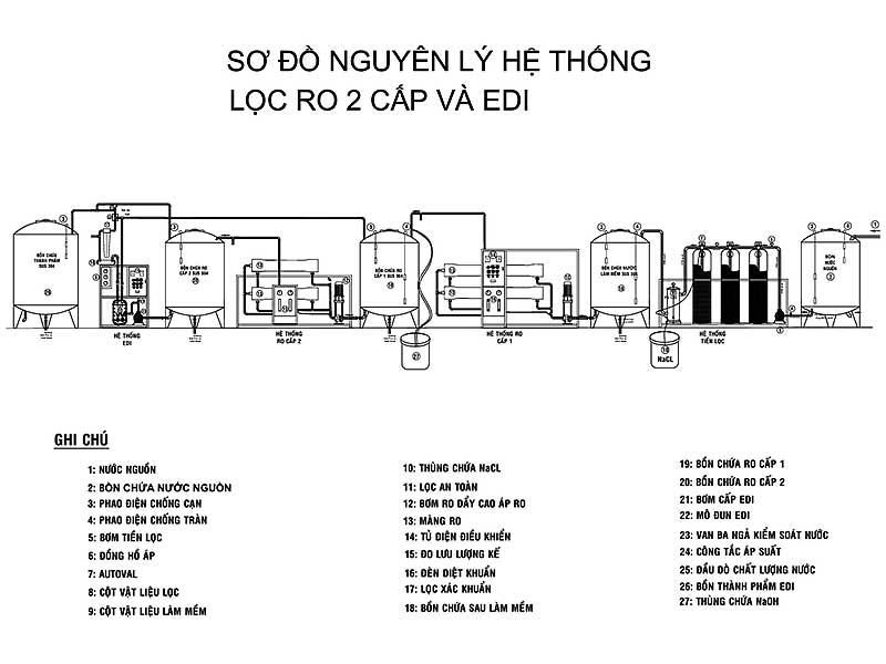 Sơ đồ hệ thống xử lý nước bằng RO 2 cấp kết hợp EDI